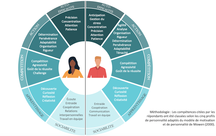 Les compétences citées par les répondants ont aussi été classées selon cinq profils de personnalité adaptés du modèle de motivation et de personnalité du chercheur américain John Mowen. Chaque profil est déterminé par sa propension principale à l’auto-efficacité (self efficacy), l’action (task), la compétition (compete), l’apprentissage (learn) et la sociabilité (social). L’objectif est d’analyser plus en détail les compétences associées à ces types de personnalité.