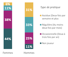 Les femmes déclarent jouer moins aux jeux vidéo que les hommes (44 % ne jouent jamais contre 11 % pour les garçons). De même, seulement 6 % des joueuses ont déclaré être des joueuses expertes (contre 31 % pour les joueurs masculins) et 11 % ont déclaré être des joueuses régulières (contre 33 % pour les joueurs masculins).