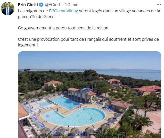 Alors que 234 migrants transportés par le navire humanitaire de SOS Méditerranée Ocean Viking tont débarqué à Toulon le vendredi 11 novembre, Éric Ciotti de LR, Thierry Mariani du RN, Éric Zemmour ou encore Florian Philippot, ont tous dénoncé les conditions luxueuses de ces rescapés, qui selon eux allaient être logés dans le luxueux villages vacances Belambra situé sur la presqu'île de Giens. Une photo montrant les piscines et les transats de ce lieu de vacances a largement été diffusée.
